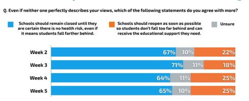 Echelon Insights at the Harvard Kennedy School recently queried parents about their concerns regarding education and Covid-19. Weekly surveys (April 27 – May 25) of 500 K-12 parents were conducted. It seems the San Diego teachers and American parents have aligned beliefs about the need for safety and the promise of strong learning.