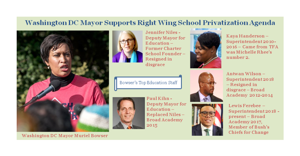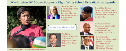 In the chart above, notice that all of the key employees she chose to lead DC K-12 education have a strong connection to organizations practicing what Cornell Professor Noliwe Rooks labels “segrenomics.” In her book Cutting School (Page 2), she describes it as the businesses of taking advantage of separate, segregated, and unequal forms of education to make a profit selling school. Bowser’s first Deputy Mayor for Education, Jennifer Niles, was a charter school founder. Her second Deputy Mayor, Paul Kihn, attended the infamous privatization centric Broad Academy. She inherited Kaya Henderson as DCPS Chancellor and kept her for five years. Kaya Henderson, a Teach For America alum, was the notorious Michelle Rhee’s heir apparent. The other two Chancellors that Bowser chose, Antwan Wilson and Lewis Ferebee, also attended the Broad Academy and both are members of Jeb Bush’s Chiefs for Change.
