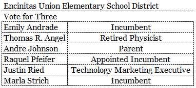 Emily Andrade was first elected to the EUSD board in 2010 after spending time as a principal at three different schools in the district. Marla Strich was originally elected to the EUSD board in 1998. In 2000 she completed the California School Board Association’s Masters in Governance professional development series. Raquel Pfeifer is workforce development facilitator for San Diego State’s Academy for Professional Excellence in the Child Welfare Development Services program. Her facebook page indicates she is running on a slate with Strich and Andrade. The Encinitas Teachers Association supports this slate.
