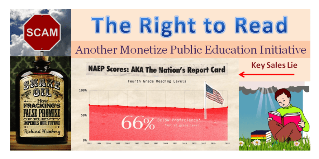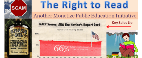It put schools in a no win situation because the only strong correlation in standardized testing is with family income. Obviously, the broken communities were the problem not their schools. This subterfuge led to claims that reforming “failing schools” was the civil rights agenda of our time. Now “The Right to Read” is playing that same phony civil rights card. It is a contemptuous lie used to profit off the backs of the poor and people of color.