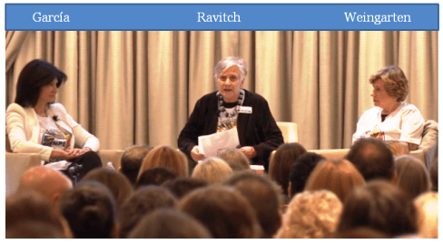 Both García and Weingarten were excellent presenters, consummate professionals, who did not disappoint. Most of the hour, Ravitch asked questions about topics, like teacher tenure and the scurrilous attack on classroom teachers. Answers from both union leaders received big positive responses.