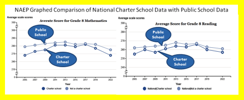 CREDO with its fancy math found that charter schools in the nine cities they studied outperformed public schools. However, there is no way to check the results since only they have access to the data. The graphs below were created by staff at the National Assessment of Education Progress, comparing eighth grade math and reading results for charter schools and public schools.