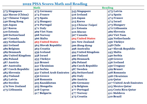 Trump’s claim that on international testing “we are literally right. Smack. Guess what? At the bottom” is an easily checked bald face lie. In 2022, the US participated in the international PISA testing. The following chart of data provided in the 2022 PISA report shows that the US was not nearly at the bottom.