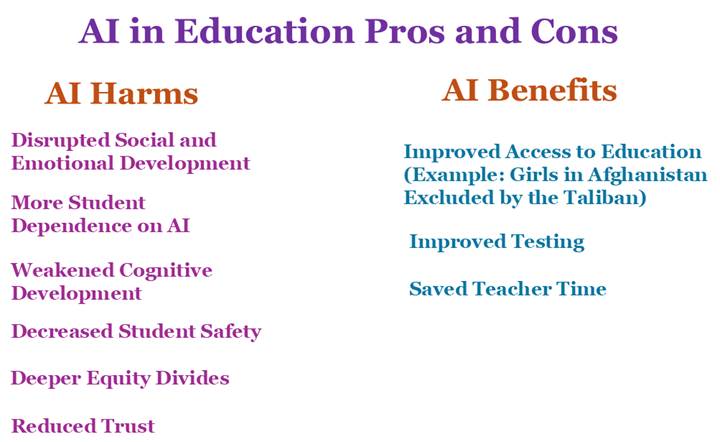 School districts throughout America are being pushed to spend huge dollars to implement artificial intelligence (AI). This Silicon Valley oligarch plan is much more about profits than good education. It is true that AI has great potential but for schools the known downsides are much larger than its present benefits. Education organizations – especially K-12 – should not spend money implementing AI at this time.