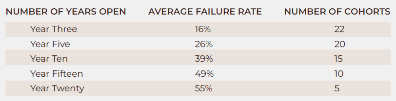 Researcher Ryan Pfleger, Ph.D. used the federal Common Core of Data to create the table above. Each cohort is comprised of every year’s batch of new charter schools. The table informs us that 16% of new charter schools close their doors within the first three years. The ten 15-year cohorts failed at a 49% rate which is a 1% improvement over the 2020 “Broken Promises” report. However, the huge federal COVID payments of 2021 probably kept many schools in business that otherwise would have failed. The 20-year failure rate of 55% makes it clear that failure keeps happening and that more than half of all charter schools close their doors forcing families to make other arrangements.