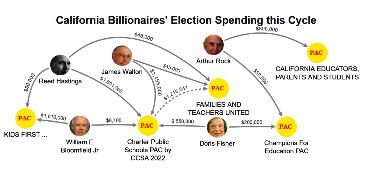 Doris Fisher (Gap Founder ID 1221980) joined Reed Hastings (Netflix CEO ID 499251) and James Walton (Walmart Heir ID 1372611) in sending the Charter Public Schools PAC (ID 1302433) $3,700,000. That PAC is administered by the California Charter Schools Association (CCSA). Charter Public Schools PAC put $1,200,000 into Families and Teachers United as well as donating to several key school board candidates including $375,000 to Kate Dao.