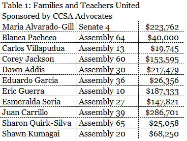 CCSA sponsors the PAC Families and Teachers United (ID 1367043). This PAC is mainly funded by the Charter Public School PAC. Families and teachers concentrates its campaign giving on getting preferred state legislative officials elected. Table 1 gives the details for how they distributed $1,429,000.