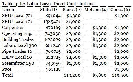 SEIU local 99 is not the only union spending with the billionaires. With no limit on independent expenditure, direct contributions to candidates have less value than they used to but are a source of money that candidates control themselves. The campaign spending limit for this race is $1,300 but it can be given in both the primary and general election. Table 3 shows direct contribution spending by local LA unions. It is all going to the billionaire supported candidates.