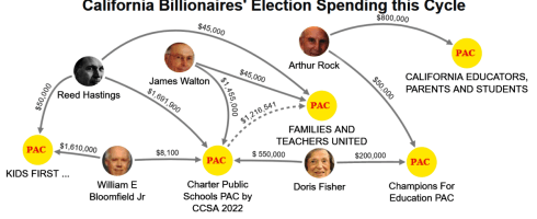 Doris Fisher (Gap Founder ID 1221980) joined Reed Hastings (Netflix CEO ID 499251) and James Walton (Walmart Heir ID 1372611) in sending the Charter Public Schools PAC (ID 1302433) $3,700,000. That PAC is administered by the California Charter Schools Association (CCSA). Charter Public Schools PAC put $1,200,000 into Families and Teachers United as well as donating to several key school board candidates including $375,000 to Kate Dao.