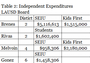 Unfortunately, 300,000 teachers giving small donations are easily outspent by one billionaire. But surprisingly the lions share of the big money going to her pro-charter school opponent, Maria Brenes, is coming from the Service Employees International Union (SEIU) local 99. Form 57s filed with the Los Angeles City Ethics Commission show the three Independent Expenditure committees local 99 sponsors are spending more than $7,500,000 to elect the neoliberal candidates. This is spending directed at privatizing public education.