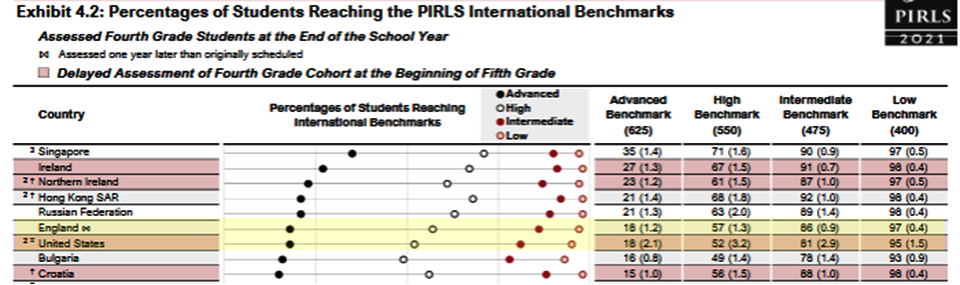 Besides citing people like Gove and Hirsch to sell this new behaviorist approach to education, Toppo writes, “From 2011 to 2021, English students’ average scores in the PIRLS International Benchmarks of Reading Achievement, a key global comparison, rose six points, placing them fourth worldwide, while U.S. students’ dropped eight points, ranking the U.S. just below England.”