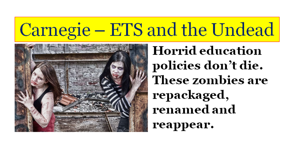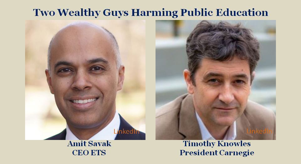 ‘The 74’ is an oligarch funded online, daily education publication, promoting the neoliberal agenda. Their cheerleading article about the Carnegie-ETS proposal had no pushback when quoting Carnegie President Timothy Knowles’ unlikely to be true statement,