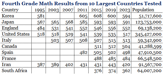 Forty-seven countries participated in the 2023 TIMSS 4th grade math study. Many of the countries studied were quite small with only Japan and the United States having populations of more than 100 million people. Using the World Population Review, I added population data to the TIMSS data and have put it into the following table for the 10 most populous countries assessed.
