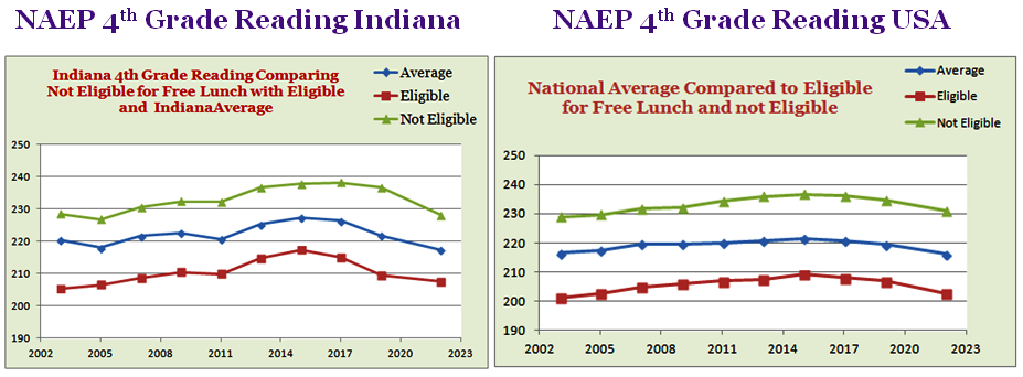 To check if there was any reality to Aldeman’s graph, I interrogated data from the National Assessment of Education Progress (NAEP). Using free lunch as a proxy for low-performing students, both national data and Indiana data for 4th grade reading was graphed. NAEP, known as the nation’s report card, has given the same type of reading exams since 1992. Indiana changed its ELA testing regime in 2018 which makes evaluating data from 2010 when the last testing method was adopted, difficult to impossible. It lacks continuity.