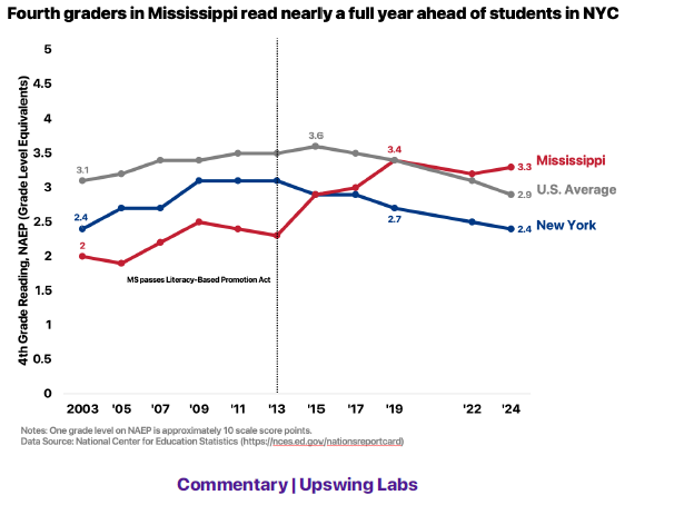 The first article in a series of posts promoting the “Mississippi Miracle” was written by Wakelyn and Michael Hartney for the New York Post. Its headline read, “NYC should look to the Mississippi Miracle to learn how to teach reading.” Upswing Labs produced two papers in June called “Mississippi or Manhattan” and “Dynamic Districts & States: Where and How Literacy Is Improving.” The last article is Wakelyn’s The 74 article on June 25.